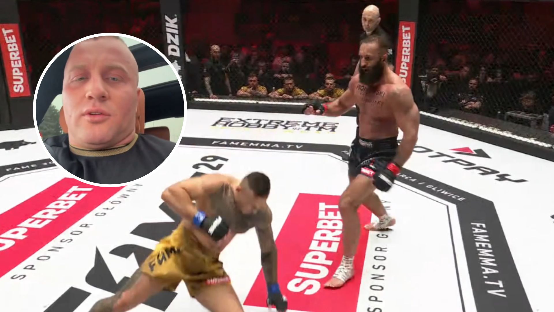 Do bezpośredniej eskalacji doszło podczas co-main eventu FAME MMA 29, czyli pojedynku Dawida Załęckiego z Bartoszem Szachtą. Denis nie ograniczył się do biernego obserwowania walki ojca – przez całe starcie skupiał się na prowokowaniu byłego przyjaciela. „Crazy” konsekwentnie rozbijał nogę rywala, a Szachta niemal każdą przerwę poświęcał na odpowiadanie w stronę trybun. Ostatecznie pojedynek zakończył się już w pierwszej rundzie, po której Bartosz w asyście ochrony opuścił klatkę.